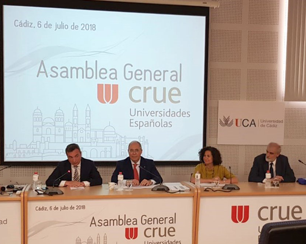 Viernes, 6 de julio de 2018. La Universidad de Cádiz acogió hoy la reunión de la segunda Asamblea General Ordinaria celebrada este año por Crue Universidades Españolas. En el encuentro, el presidente de la institución, Roberto Fernández, detalló a los rectores el punto en el que se encuentra la Agenda Política aprobada el pasado 2 de febrero en Valencia, iniciativa con la que Crue Universidades Españolas pretende impulsar una nueva Ley de Universidades. Roberto Fernández afirmó que la institución tiene «la aquiescencia de los Consejos Sociales, las principales organizaciones sindicales y empresariales de España, de la Cámara de Comercio y de la Coordinadora de Representantes de Estudiantes de Universidades Públicas (CREUP) para solicitar formalmente al Parlamento la aprobación de una nueva Ley Orgánica que facilite a la Universidad los recursos necesarios para afrontar el desafío que supone conducir a España hacia una Economía del Conocimiento. En este sentido, avanzó que el próximo mes de septiembre todos los actores implicados harán público un comunicado en la Sala Ernest Lluch del Congreso de los Diputados.