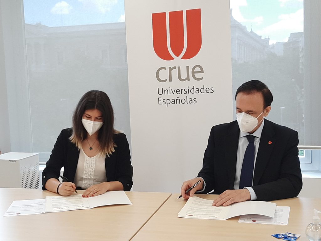 Madrid, 22 de junio de 2021. Crue Universidades Españolas y la Coordinadora de Representantes de Estudiantes de Universidades Públicas (CREUP) han renovado el convenio marco de colaboración por el que ambas organizaciones se comprometen a trabajar conjuntamente en el ámbito de la educación y formación, la cooperación solidaria y la colaboración con organismos públicos con el fin de lograr que España desarrolle un Sistema Universitario social y de calidad.